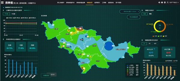 吉林耕地质量保护大数据平台,利用GIS、物联网、人工智能等新一代信息技术,围绕“1+1+N”模式,搭建了“一个中心、一个平台、N个应用”模式。系统汇集了土、水、肥三大耕地质量数据,宏观展示了全省及各市的土壤类型、耕地质量等级、土壤养分含量等数据,对数据进行统一归纳与整合。将以前被忽略的数据进行有效利用,提高了部门间数据共享的效率,形成了可靠的决策驾驶舱,为落实“藏粮于地,藏粮于技”战略夯实了数据基础。