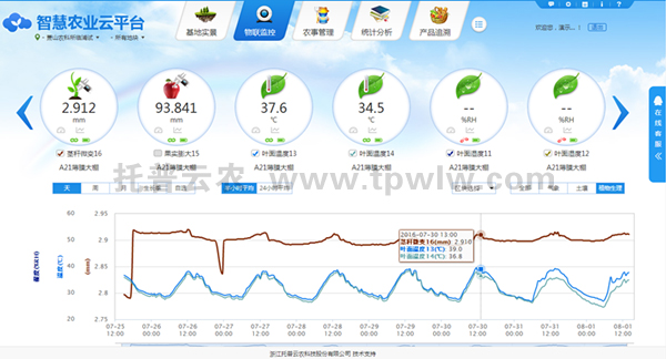 园区内监测到的土壤水分、土壤温度,空气温湿度、二氧化碳、光照强度等数据直观展现,也可监测植物本体参数茎秆微变化、果实膨大、叶片温度等??砂刺?、周、月、生长季进行查看。