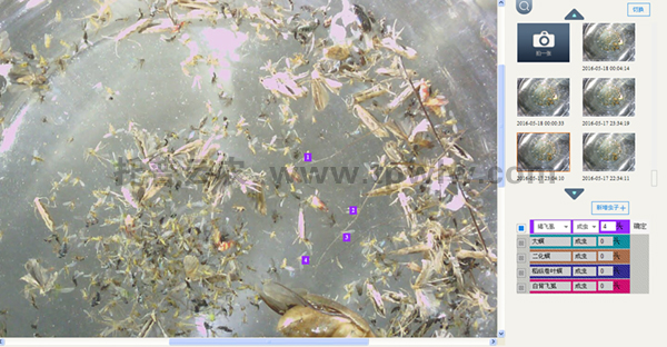 通过远程可拍照式虫情测报灯采集到的虫情照片,可设置拍照时间定时上传,也可随时远程拍照,即拍即看。高清照片清晰查看虫情状况,更有虫情识别软件自动识别稻飞虱、二化螟等水稻类虫害,自动计数。
