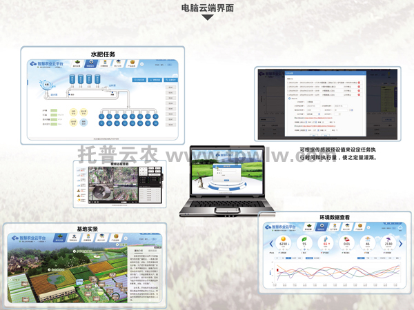 ?????? 可在托普智慧农业云平台选择地块、作物、传感器等信息,日、周、月查看监测数据,也可设置作物生长环境参数安全阀值,高于或低于设置时系统会自动预警;远程设置水肥任务的时间、次数;远程查看温室内的视频信息,实时掌握温室内的苗情、灾情信息;可根据采集的温室环境信息,形成数库,为合理安排农事工作、专家库建设提供数据模型;后台可对种植品种生成二维码,一键追溯生长环境信息、施肥施药信息、成长相册、检测报告等,实现对作物品种的全程可追溯;可接入专家系统,可为基地种植人员提供水肥精准化管理、病虫害绿色防控等农技指导、诊断与交流,保障农业高产高效。