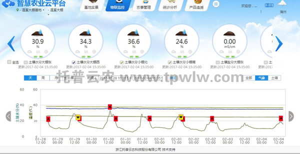 浙江托普云农水肥一体化监控系统能够实时监测基地大葱的种植环境,实现智能化、定时定量的灌溉,其中包括系统云平台、视频监控系统、采集终端、施肥机、过滤系统、阀门控制器、电磁阀、田间管路等。系统所采集的数据实时上传到托普智慧农业云平台,并快速进行统计分析,解决了工作人员对数据的采集分析需求,并确保了数据采集的精准、快速、全面。用户可通过手机APP和电脑端远程实时查看基地现场视频、水肥流量统计数据,也可远程手动设置水肥参数,很大程度上提高了灌溉用水效率。