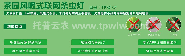 ? ? 托普茶园专用杀虫灯利用光近距离、波远距离引诱害虫成虫扑灯,主要诱杀茶园中的叶蝉、金龟以及众多的鳞翅目害虫,利用LED窄波,?;ぬ斓?。设备独有的远程控制功能可在GIS地图在线查看区域内杀虫灯工作状况、开关灯情况、设备预警,无需跑到茶园管理,该设备的引入,提高了古丈县茶园绿色管控水平,为促进古丈县茶叶产业持续快速发展,为茶农增收、茶叶提质提供了有效途径。