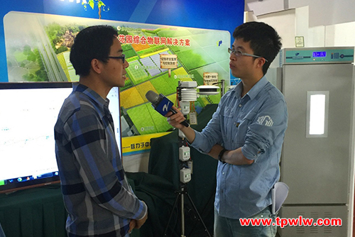 图为工作人员接受记者采访除了展示1500多个瓜菜新优品种,很多企业带来的最新农业种植和管理技术特别吸引眼球,浙江托普云农科技股份有限公司(以下简称“托普云农”)的物联网系统,引得前来采访的记者驻足。