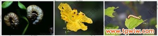 图为:啃食植株的蛴螬、莹虫、毛毛虫