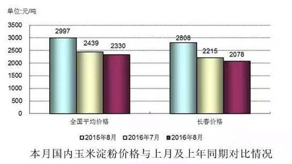 2016年7-8月份国内淀粉价格先跌后涨,总体仍呈下跌趋势。8月份全国淀粉平均价格为2330元/吨,环比下降108元/吨,降幅4.45%;同比下降667元/吨,降幅22.25%。其中,长春地区淀粉出厂价格为2078元/吨,环比下跌137元/吨,降幅6.18%;同比下降730元/吨,降幅25.99%。