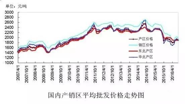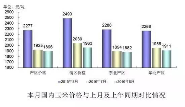 2016年8月份,我国玉米产区平均价格1896元/吨,比上月下降28元/吨,降幅1.48%;同比下降381元/吨,降幅16.73%。其中,东北产区价格为1882元/吨,环比下降12元/吨,降幅0.66%,同比下降407元/吨,降幅17.77%;华北黄淮产区价格为1911元/吨,环比下降44元/吨,降幅2.27%,同比下降355元/吨,降幅15.68%;国内销区玉米价格为1963元/吨,环比下降76元/吨,降幅3.75 %,同比下降527元/吨,降幅21.18%(图)。