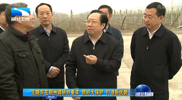 11月17日,湖北卫视《湖北新闻》以《王晓东在荆州调研时要求 抓好大?;?打造新优势》为题,报道湖北省委副书记、省政府代省长王晓东在荆州调研时强调要认真学习贯彻十八届六中全会精神,树立新的发展理念,着力打造发展新优势,走出一条生态优先、绿色发展的新路子。