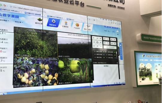 巨型的显示大屏上,即时闪动着果园的光照度、空气温湿度、土壤温湿度,摄像头连上传感器,向“中枢”传送着每颗果实的最新生长情况。