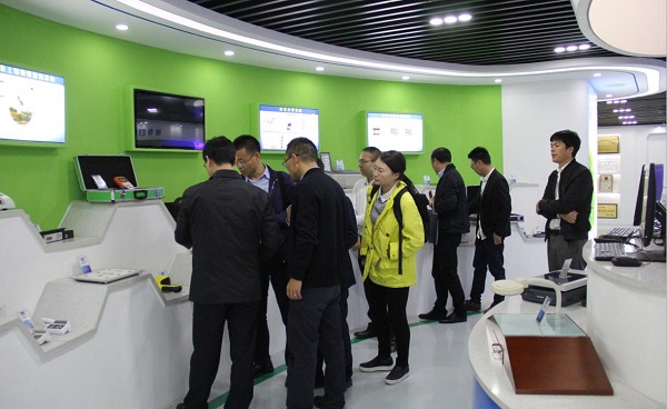 图为:朱旭华副总经理向谢主任介绍智能硬件产品