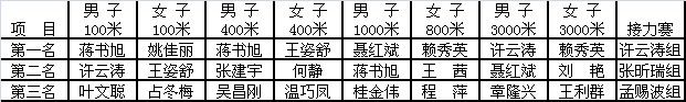 此次田径运动会分为男子100米、女子100米;男子400米,女子400米;男子1000米,女子800米;男子3000米,女子3000米;男女混合4*200米接力赛。赛制为,初赛?。孔槿∏傲矫统杉ㄗ詈玫牧矫擦嗽苯刖鋈┣叭刖鋈?,决赛取前三名为获奖选手。上午9:10,运动会在女子400米初赛中拉开帷幕。