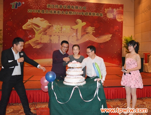 年会晚宴进行到中段,工作人员推上来一个漂亮的三层蛋糕,陈总、婷姐、朱总三人一起切开蛋糕,为托普十周岁生日庆贺。每一位托普家人脸上都绽开幸福的笑容,口中轻唱着欢乐的生日歌,为托普仪器的成长送去诚挚的祝福。