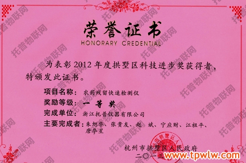2012年度拱墅区科学技术进步奖通过企业申报,有关部门推荐,并经专家评审,托普仪器农药残留快速检测仪项目最终获得2012年度拱墅区科技进步奖一等奖。