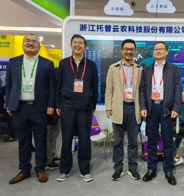 四川省农业农村厅植物?;ふ疽抡境ぃㄓ叶?、湖北省植物?;ぷ苷竟悠秸境ぃㄗ笕⑻旖蚴信┮捣⒄狗裰行男旖úǜ辈砍ぃㄗ笠唬?、湖北省植物保护总站周华众副站长(左二)莅临托普云农展位