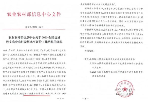 我国已持续多年开展县域数字农业农村发展水平评价工作,这已经成为推动县域数字农业农村发展的有力杠杆。2020年底,由农业农村部市场与信息化司会同农业农村部信息中心共同发布的《2020全国县域数字农业农村发展水平评价报告》(以下简称“报告”)显示,2019年全国县域数字农业农村发展总体水平达36.0%,较上年提升3个百分点。报告还确定德清县等100个县(市、区)为“2020全国县域数字农业农村发展先进县”,成为各地数字乡村建设的“风向标”。其中,德清县在全国2400多个县(市、区)中以总分全国第一的成绩脱颖而出,连续两年获此殊荣。