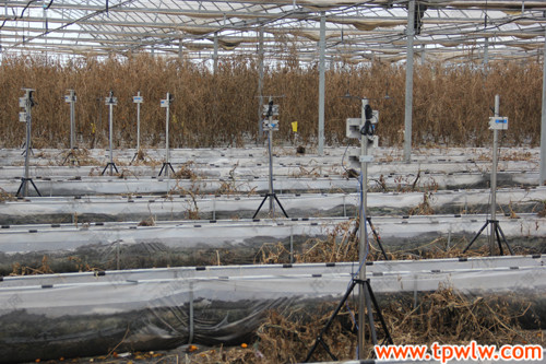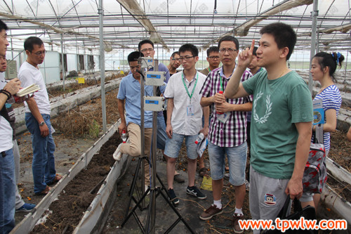 图为:大棚内所种作物????在大田的参观中,大家看到了工作中的田间气象站及中继节点,在检测土壤信息的同时,还兼顾测试气象情况,为实现合理化灌溉及用肥提供科学依据。