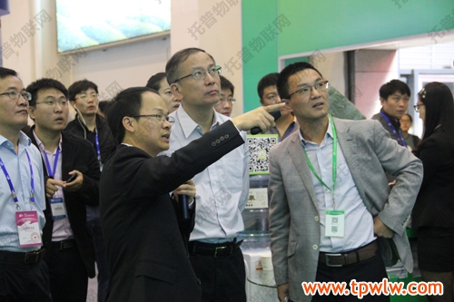 图为:浙江省农业厅史济锡厅长正在了解四大系统及传感器