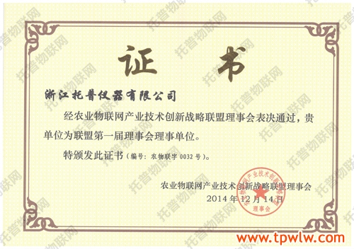 2014年6月7日,北京智慧农业物联网产业技术创新战略联盟筹备成立大会暨第一次会员代表大会在北京召开。会议宣读了决定准予《北京智慧农业物联网产业技术创新战略联盟》筹备的行政批复,并经首届理事会表决,选举产生了第一届联盟组织机构,其中包括首届联盟主席单位,五家联盟副主席单位,“浙江托普仪器有限公司”等八家单位当选为联盟第一届理事会理事单位。