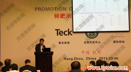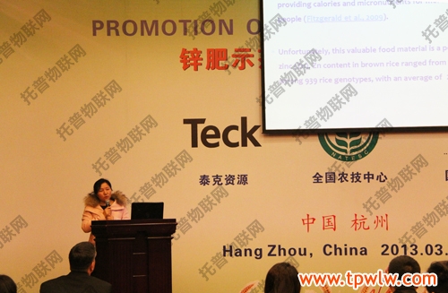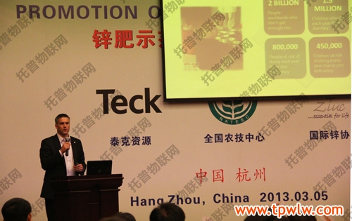 在上午的锌肥示范推广技术培训与研讨会上,会议邀请了国际专家加拿大泰克资源安德鲁·格林教授、国际锌协会樊明宪教授、国内专家浙江大学副教授冯英、天津市土壤肥料工作站郑育锁科长讲解了锌肥技术以及锌肥在中国农业生产中试验示范研究结果。据国际锌协会报道,全球种植谷物的土地中有50%存在缺锌的潜在危险、而我国土壤普遍缺锌。农作物缺锌主要与干旱缺水、盐碱、渍涝等农田环境有关,科学施用锌肥是解决农业缺锌问题的主要途径。近年来,随着节水农业的不断发展,水肥一体化逐渐成为新的锌肥科学施用方式。科学施用锌肥,能够提高作物产量,改善农产品品质。为促进锌肥的科学施用,广泛宣传锌对作物生产和人体健康的作用,全国农技推广中心与国际锌协会、加拿大泰克资源合作开展锌肥示范推广工作,并大力培养应用技术人才、开展田间技术指导。