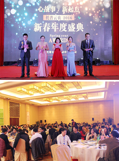 羊随新风辞旧岁,金猴献瑞迎新春。2016年1月30日,“新起点 新起航——托普云农2015年度总结表彰大会暨2016迎新春联欢会”在杭州海外?!つ纱ù缶频曷≈鼐傩小?00余名托普家人共聚一堂,回顾这一年所取得的成绩,规划2016年新的奋斗目标,共同迎接欢乐幸福的农历新年。