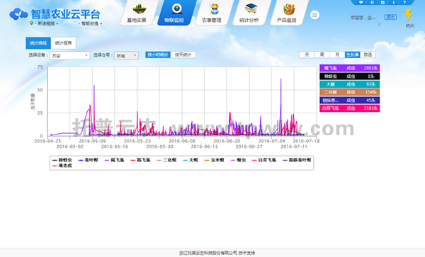 系统通过搭建在田间的智能虫情监测设备,可以无公害诱捕杀虫,绿色环保,同时利用GPRS/3G移动无线网路,定时采集现场图像,自动上传到远端的物联网监控服务平台,工作人员可随时远程了解田间虫情情况与变化,制定防治措施。通过系统设置或远程设置后自动拍照将现场拍摄的图片无线发送至监测平台,平台自动记录每天采集数据,形成虫害数据库,可以各种图表、列表形式展现给农业专家进行远程诊断。