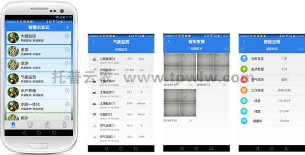 - 农林(农业)“四情”监测系统发表日期:2021-02-25 来源:托普云农 浏览次数:205634次托普农业物联网农林“四情监测预警系统”(墒情、苗情、虫情、灾情)也叫农业四情监测系统,简称农林“四情”监测系统,它以先进的无线传感器、物联网、云平台、大数据以及互联网等信息技术为基础,由墒情传感器、苗情灾情摄像机、虫情测报灯、网络数字摄像机、作物生理生态监测仪,以及预警预报系统、专家系统、信息管理平台组成。各级用户通过Web、PC与移动客户端可以访问数据与系统管理功能,对每个监测点的病虫状况、作物生长情况、灾害情况、空气温度、空气湿度、露点、土壤温度、光照强度等各种作物生长过程中重要的参数进行实时监测、管理。系统联合作物管理知识、作物图库、灾害指标等??椋宰魑锸凳痹冻碳嗖庥胝锒?,提供智能化、自动化管理决策,是农业技术人员管理农业生产的“千里眼”和“听诊器”。