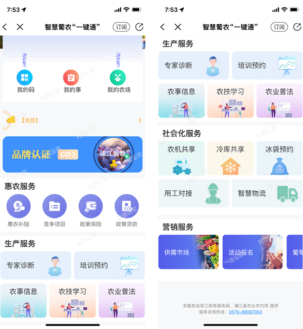 农户可在应用中一键申请“浦江葡萄”地理标志农产品授权,县农业农村局借助AI智能设备以及葡农的“精准画像”,对种植规?!?0亩、亩产低于3000斤、葡龄3年以上的农户进行一键授权,提升“浦江葡萄”品牌的溢价能力,推动葡农控产提质。对授权的品牌产品建立追溯体系,整合葡农的农场、产品、质检等信息生成溯源码,通过扫码即可查询葡萄从种植到销售的全链条信息。