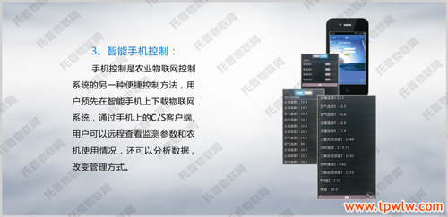通过物联网系统可连接传感器采集土壤温度、湿度、养分含量(N、P、K)、PH值、降水量、空气温湿度、气压、光照强度等来获得作物生长的适宜条件,并根据参数变化实时调控或自动控制温控系统、灌溉系统等;