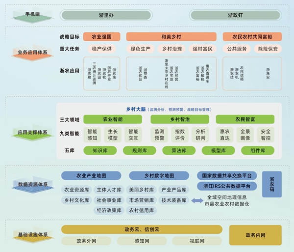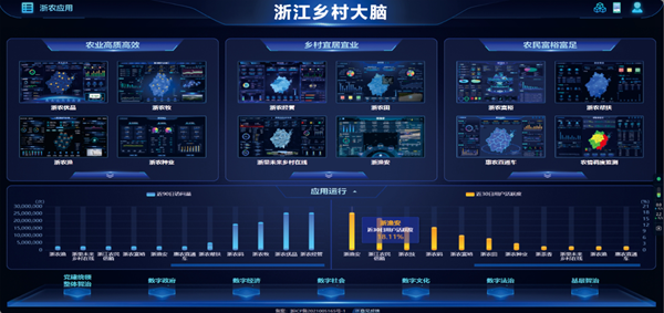 浙江省农业农村厅围绕省委数字化改革决策部署,聚焦大脑监测分析评价、预测预警和战略目标管理能力的新目标,大力推进"浙江乡村大脑 +浙农系列应用"体系建设,迭代形成以"11153"核心构架为支撑的"浙江乡村大脑"(1个数据仓,1张全域地理信息图,1个"浙农码”,5个库为知识库、规则库、算法库、模型库和组件库,3领域能力为农业智能、乡村智治、农民智富),按照'一表一图N清单"的方法,开发建设9个智能???,以数字技术助力农业农村现代化、乡村振兴和农民农村共同富裕。目前,"浙江乡村大脑"已实现省市县三级贯通。