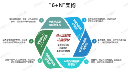 该方案基于"6+N"架构构建:全密闭式环境控制系统精准调控温湿度及CO?浓度,隔绝外界干扰;全光谱LED光系统动态调整红蓝光配方适配作物生长周期;立体栽培系统通过平面、多层、气雾模式灵活适配产能需求;智能水肥系统实时监测营养液成分并自动调配灌溉;自动化设备实现播种、移栽、采收全流程无人化操作;AI中枢整合物联网与大数据,提供生长预测与病害预警;另可扩展植物表型分析、环境监测等N个定制???/span>,形成闭环智能生产体系。